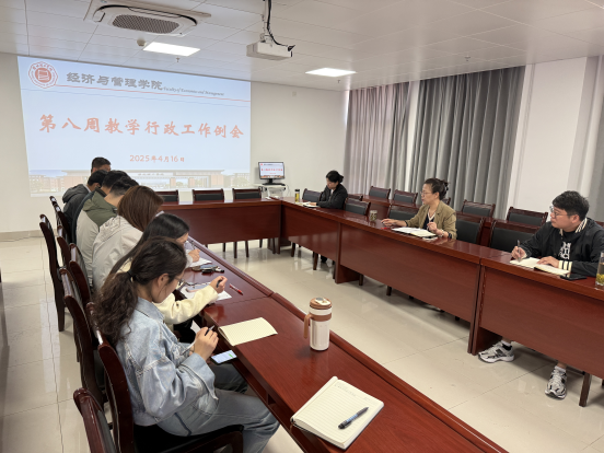 2025年4月16日,bat365在线中国官网登录入口在行政楼725召开第八周行政工作例会,院长助理张珊、叶赵强,教学秘书李健及各教研室主任出席会议,会议由院长吴玲主持。