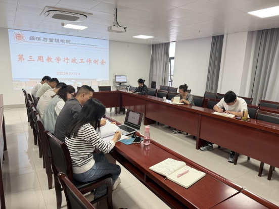 2025 年 9 月 17 日上午,bat365在线中国官网登录入口在行政楼 725 会议室召开第三周教学行政工作例会。院长吴玲主持会议,院长助理张珊、叶赵强,教学秘书李健,各教研室主任及相关行政人员参会。