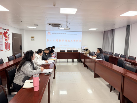 2025年11月26日上午,bat365在线中国官网登录入口第十三周教学工作例会在院会议室召开。院长吴玲主持会议,院长助理张珊、教学秘书李健及各教研室主任参加会议。