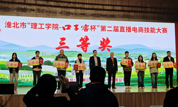 2025年10月26日,淮北市“理工学院-口子窖杯”第二届直播电商技能大赛在bat365圆满落幕。值得关注的是,bat365携手杜集区共同推进的“一村一主播”项目对接村——南山村、大庄村、段庄村代表队在决赛中表现突出,荣获大赛三等奖,充分展现了校地协同育人的丰硕成果和乡村电商发展的新风貌。