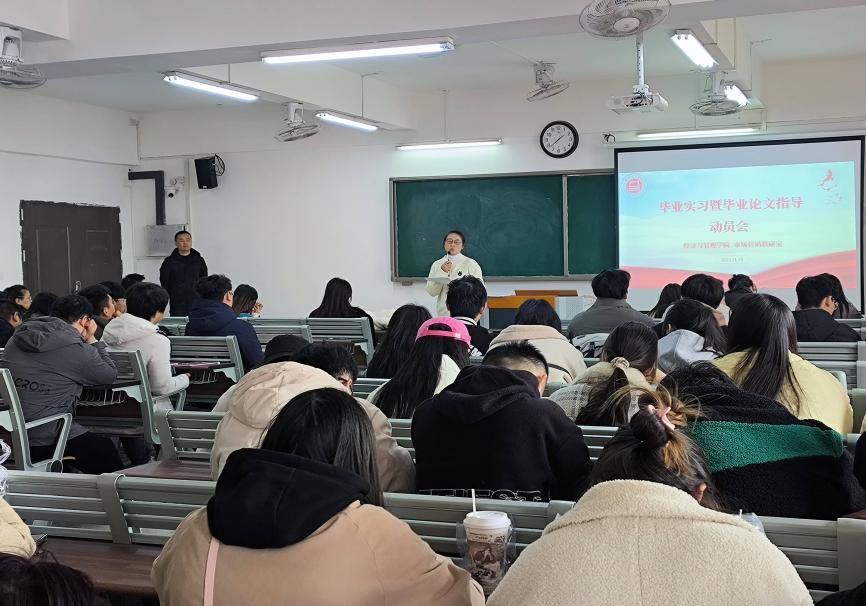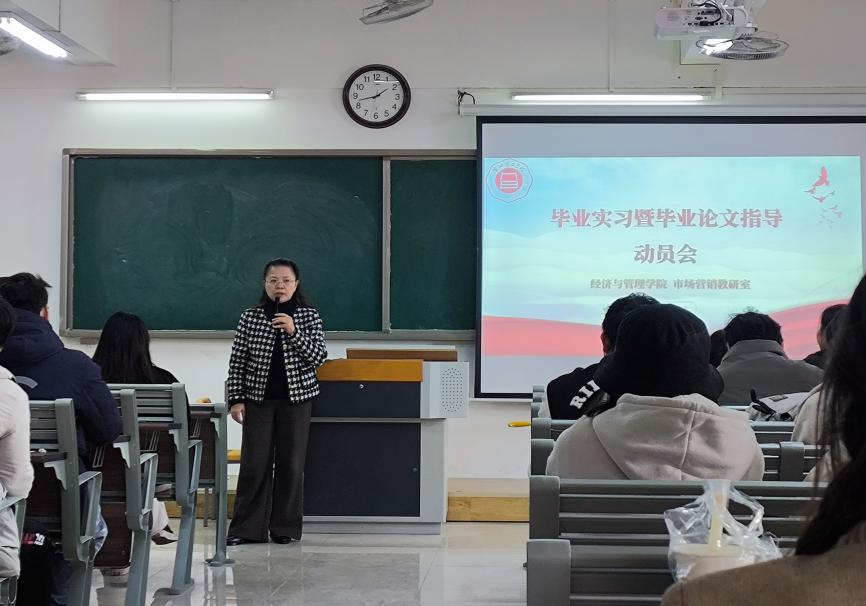 为进一步提升学生的就业竞争力,增加社会实践知识,保证2024届学生实习工作顺利开展,帮助学生了解实习安排,2023年11月15日下午,经济与管理学院市场营销专业在二教421室顺利召开了2024届毕业实习暨毕业论文指导动员会。经济与管理学院院长吴玲、市场营销教研室全体指导教师及2022级市场营销专升本学生参加会议,会议由教研室负责人刘路路主持。