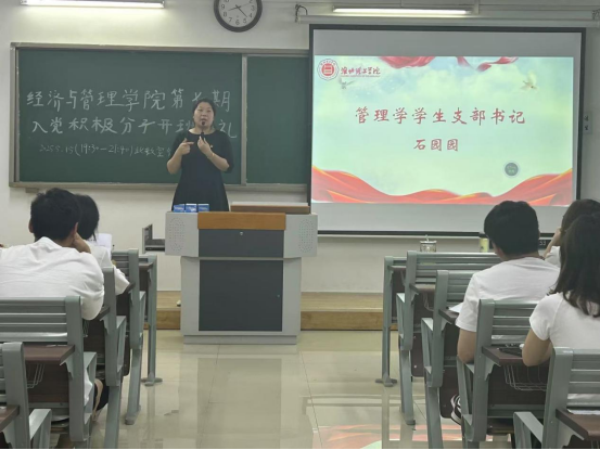 典礼伊始,管理学学生支部书记石园园发表讲话。她详细解读了《bat365在线中国官网登录入口第七期入党积极分子培训班学员手册》,重点强调课程内容和时间安排,指出本次培训是入党积极分子系统学习党的理论知识、端正入党动机、提升党性修养的重要契机。石书记还对全体学员提出了明确要求,希望学员们珍惜此次学习机会,严格遵守培训纪律并完成相关学习要求(包括学习强国的学习,心得体会撰写等),认真学习党的章程、党的历史和党的基本理论,努力做到学有所思、学有所悟、学有所得,以实际行动向党组织靠拢。