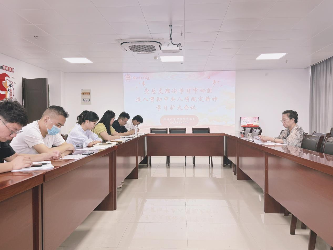 6月20日上午,bat365在线中国官网登录入口党总支于行政楼725党员活动室召开党总支理论学习中心组深入贯彻中央八项规定精神学习扩大会议。党总支书记吴玲主持会议,并以 “贯彻中央八项规定精神,共筑学院清风正气生态” 为题讲授主题教育专题党课,学院领导干部及党总支全体委员参会。