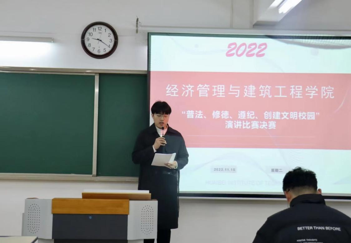 为增强学生法律知识,营造文明和谐的校园氛围,响应学校《关于开展“普法、修徳、遵纪、创建文明校园”专项活动》的文件精神,深入学习习近平法治思想,引导学生深入了解宪法、尊重宪法精神,于2022年11月15日晚七点,在二教323室举行经济管理与建筑工程学院“普法、修徳、遵纪、创建文明校园”演讲比赛。马克思主义学院院长助理陈志操、经济管理与建筑工程学院教工支部书记刘路路、经济管理与建筑工程学院书记助理叶赵强担任本场比赛评委老师,比赛由院学生会宣传部部长韩大壮主持。