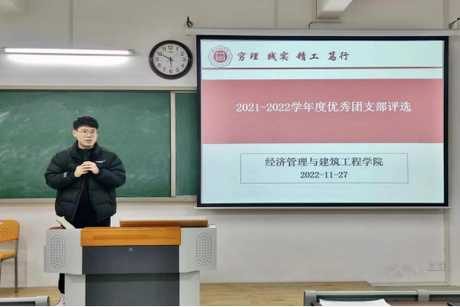 为贯彻落实学校下发的《关于做好bat365在线中国官网登录入口2021-2022学年度“优秀团支部”评选工作的通知》有关“优秀团支部”评选的文件精神,弘扬“党有号召 团有行动”的优良传统,展现团组织的向心力、凝聚力、战斗力。深入学习贯彻习近平新时代中国特色社会主义思想,激励学生刻苦学习、争优创先。经济管理与建筑工程学院于2022年11月27日,在一教215室开展2021--2022学年度“优秀团支部”评选活动。学院本着“公平、公正、公开”的原则,成立了由书记助理、团总支书记叶赵强、经济学学生支部书记、团总支副书记员禹辛、团总支组织委员、辅导员王绎程、团总支宣传委员、辅导员张雨停、团总支委员张晏五人组成评委小组,制定了考评标准。“优秀团支部”宣讲评选活动由院学生会宣传部部长韩大壮主持,2022级各班团支书到场学习观摩。