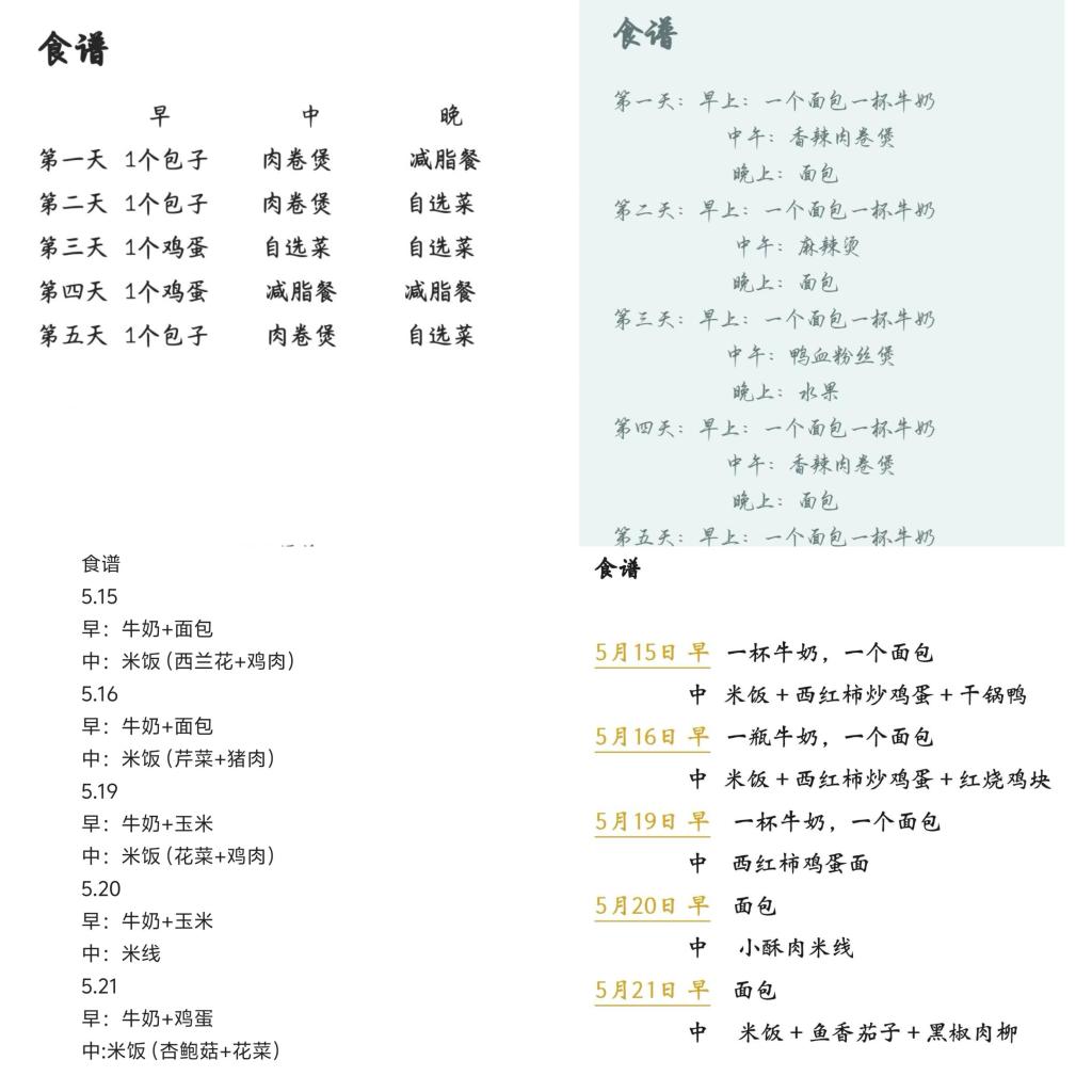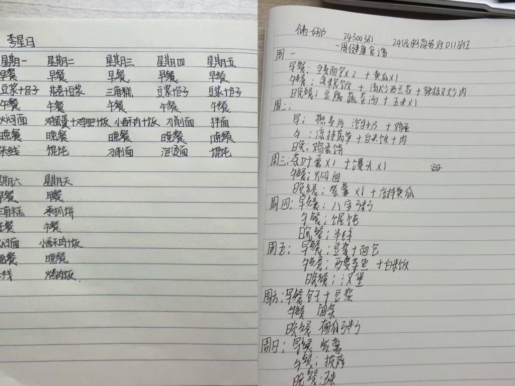 5月6日至14日,辅导员再次深入食堂,启动 “我的健康食谱我做主” 活动。学生根据自身身体状况、减肥目标及口味偏好,自主制定一周健康食谱并提交至辅导员处。辅导员逐一审核食谱,对热量配比失衡、营养搭配不全等问题及时与学生沟通,提出个性化调整建议,助力学生形成科学饮食方案。