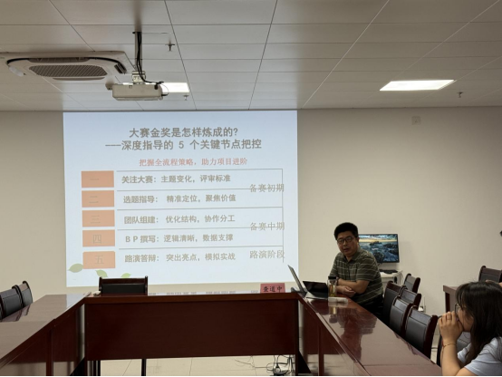 讲座中,査道中教授围绕关注大赛、选题指导、团队组建、BP 撰写、路演答辩五大板块,结合评审与指导经验,为教师们深度剖析培育金奖项目的关键方法。他指出,教师指导学生备赛时,首先要带领学生精准研读大赛规则、导向及评审标准,明确备赛方向与重点;在选题环节,应引导学生紧扣时代需求,从创新性、可行性和社会价值维度筛选打磨,确保选题脱颖而出。团队组建阶段,教师需指导学生依据专业、能力、性格等差异进行成员搭配,构建优势互补的高效团队。针对 BP 撰写,教师要指导学生梳理清晰逻辑框架,突出项目核心亮点与竞争优势;在路演答辩环节,教师应帮助学生把控细节,通过模拟演练提升自信表达能力,以最佳状态展示项目成果、打动评委。