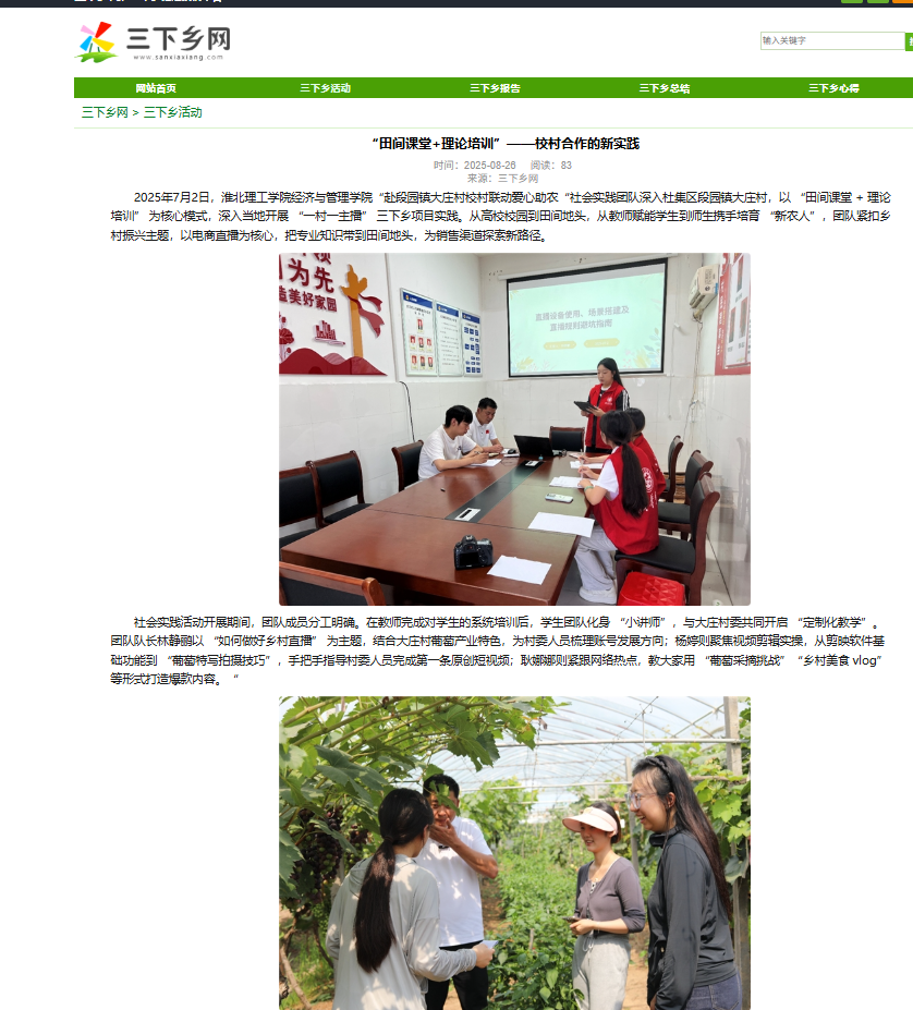 2025年7月2日,bat365在线中国官网登录入口bat365在线中国官网登录入口“赴段园镇大庄村校村联动爱心助农“社会实践团队深入杜集区段园镇大庄村,以 “田间课堂 + 理论培训” 为核心模式,深入当地开展 “一村一主播” 三下乡项目实践。从高校校园到田间地头,从教师赋能学生到师生携手培育 “新农人”,团队紧扣乡村振兴主题,以电商直播为核心,把专业知识带到田间地头,为销售渠道探索新路径。对此,三下乡网进行了报道: