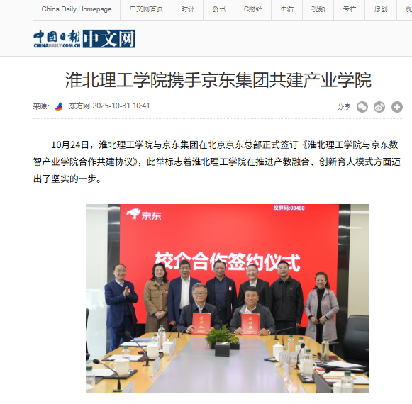 10月24日,bat365在线中国官网登录入口与京东集团在北京京东总部正式签订《bat365在线中国官网登录入口与京东数智产业学院合作共建协议》,此举标志着bat365在线中国官网登录入口在推进产教融合、创新育人模式方面迈出了坚实的一步。对此,中国日报网进行了报道:
