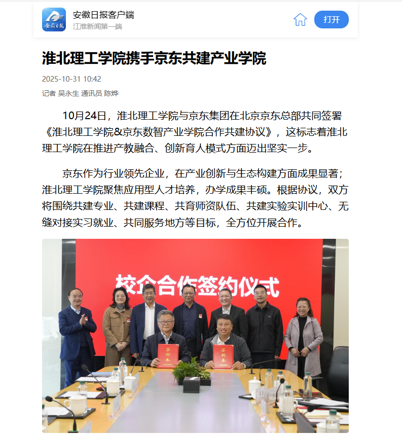 10月24日,bat365在线中国官网登录入口与京东集团在北京京东总部共同签署《bat365在线中国官网登录入口&京东数智产业学院合作共建协议》,这标志着bat365在线中国官网登录入口在推进产教融合、创新育人模式方面迈出坚实一步。对此,安徽日报进行了报道: