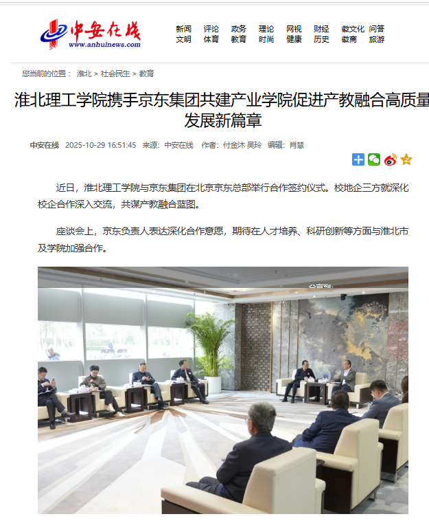 近日,bat365在线中国官网登录入口与京东集团在北京京东总部举行合作签约仪式。校地企三方就深化校企合作深入交流,共谋产教融合蓝图。对此,中安在线进行了报道: