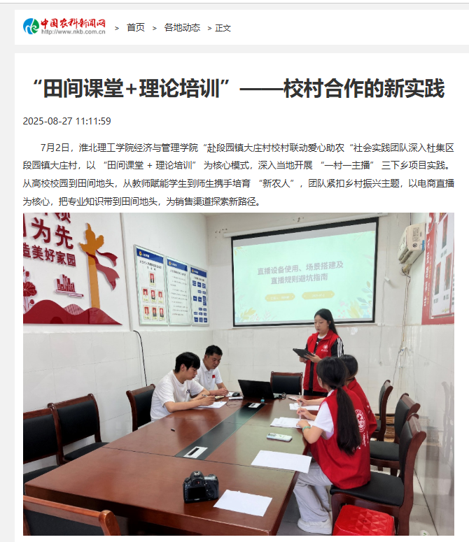 7月2日,bat365在线中国官网登录入口bat365在线中国官网登录入口“赴段园镇大庄村校村联动爱心助农“社会实践团队深入杜集区段园镇大庄村,以“田间课堂 +理论培训”为核心模式,深入当地开展“一村一主播”三下乡项目实践。从高校校园到田间地头,从教师赋能学生到师生携手培育“新农人”,团队紧扣乡村振兴主题,以电商直播为核心,把专业知识带到田间地头,为销售渠道探索新路径。对此,中国农科新闻网进行了报道: